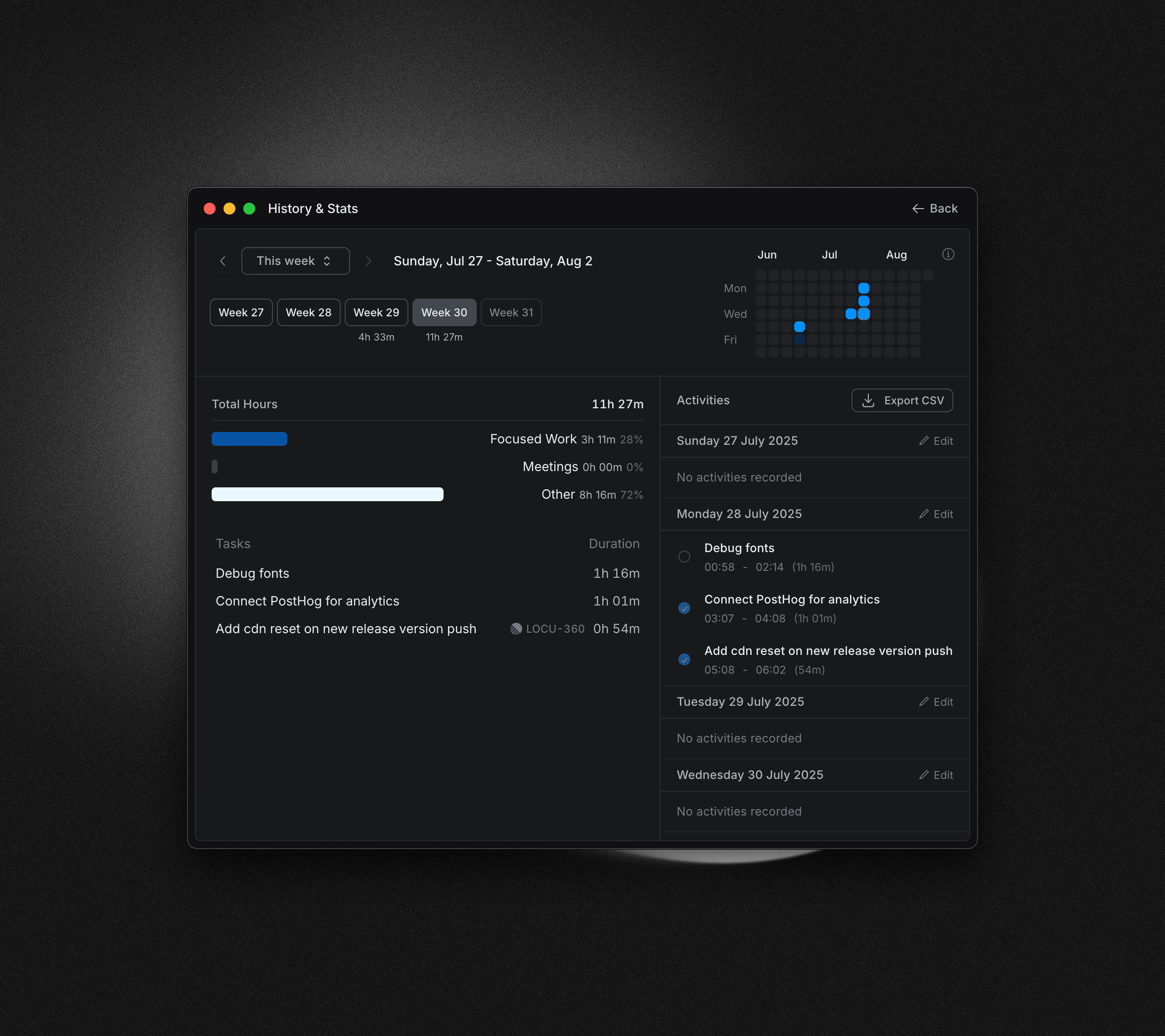 Preview of all activities within the given timeframe, with an option to edit individual day's data